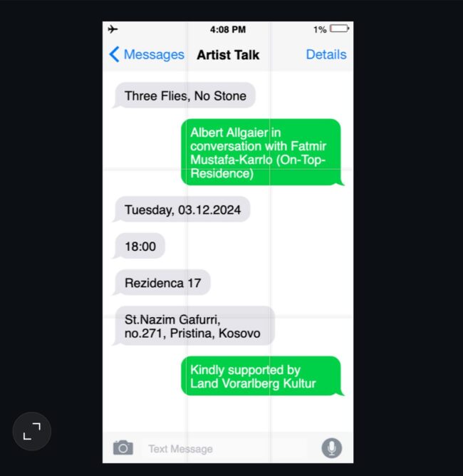 December 3, 2024 @ 6:00 pm – 7:00 pm – THREE FLIES, NO STONE Artist Talk: 03.12.2024, 18:00 at Rezidenca17 in Pristina with Fatmir Mustafa-Karrlo from On-Top-Residency.
