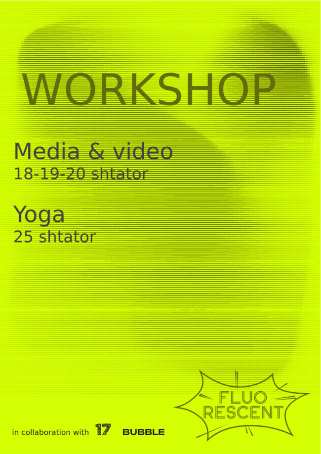 September 18, 2024 – September 20, 2024 @ 5:30 pm – 7:30 pm – Bubble Foundation dhe Shtatëmbëdhjetë, në kuadër të projektit “Fluorescent” do të organizojnë disa punëtori me synim zhvillim e kapaciteteve ndërdisiplinare të personave queer përmes trajnimeve të ndryshme. Punëtoria e medias dhe videos do të eksplorojë aspektet krijuese dhe teknike, duke ofruar njohuri dhe shkathtësi për procesin e prodhimit të videove dhe prodhimeve të tjera mediale.